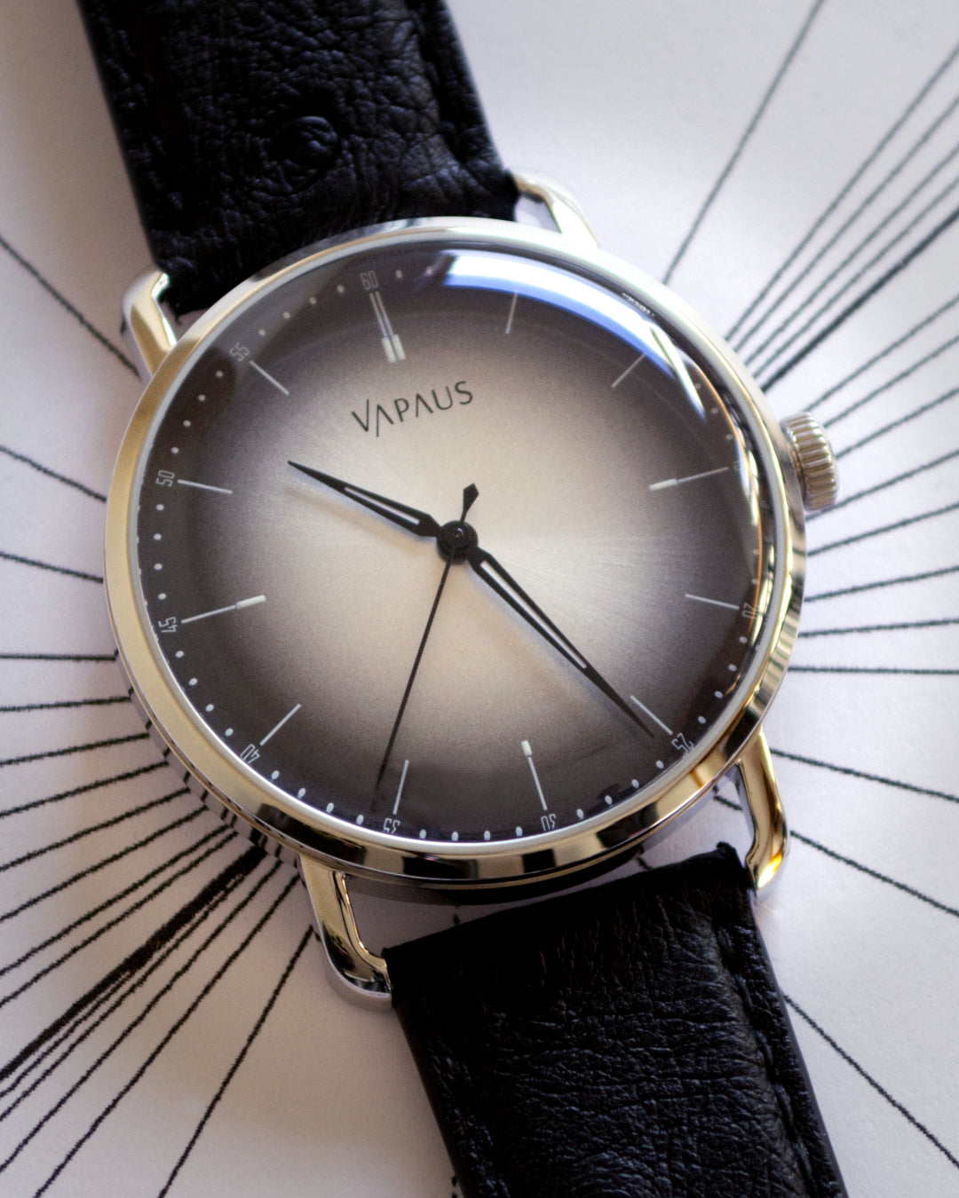 Hands: the VAPAUS Veli watch is offered with a choice of either classic alpha hands (Veli 1950), or the more unusual paddle hands (Veli 2050). The divisive Veli 2050 hands have created a loyal following among watch aficionados who enjoy the juxtaposition between a classic and modern aesthetic; while the Veli 1950 hands resonate clearly with the legacy of the timepiece.
